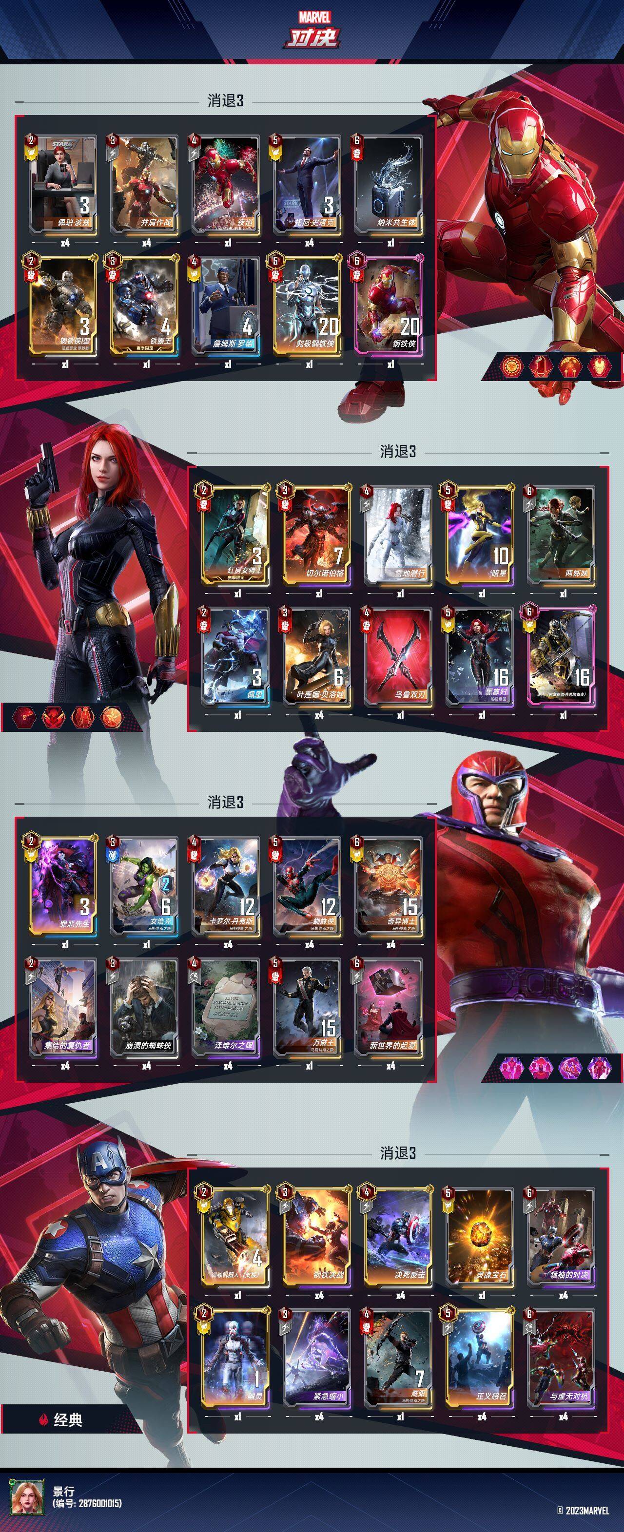 - 【消退女浩克】【消退惊】【消退万磁王】【消退鹰眼】是吃到【消退蜘蛛侠】buff主要战力成员,可以看出,五个角色五个卡位,空出一个格子,不是为了【消退惊】2+1,是留一个格子用于“打出”【叶莲娜】和【托尼】。
