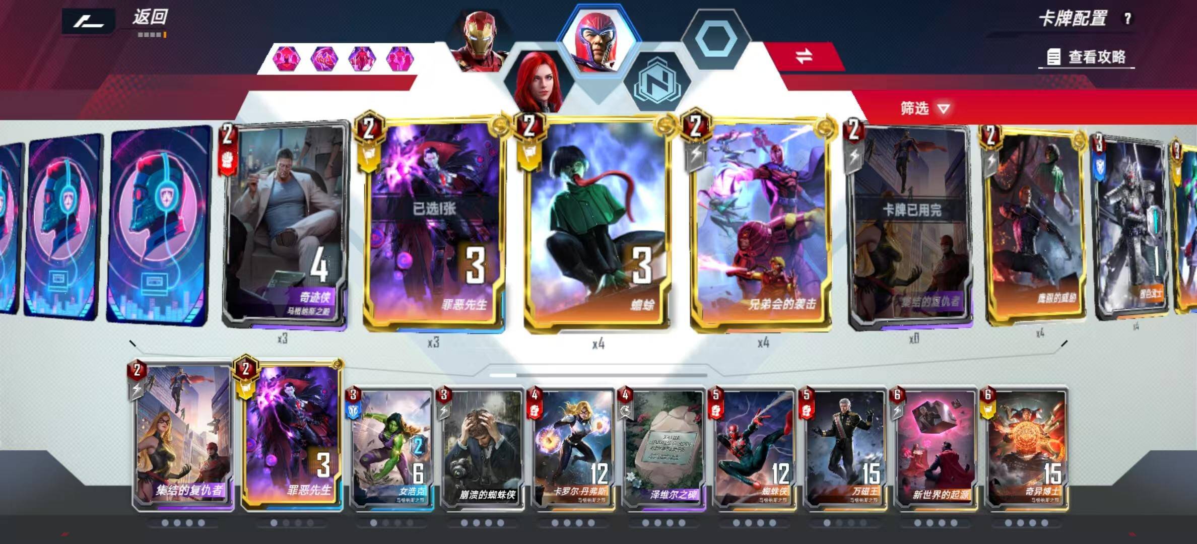 - 【崩溃的蜘蛛侠】这张卡位在他人看来或许有争议,【消退蜘蛛侠】是可以给到这个事件的,特意去购买浪费经济,不买又卡商店格子。我来解释原由,因为在某些对局里,你的蜘蛛侠来的会比较晚,导致你不能集齐第一波移除所需的“6张”事件,或者导致你不能集齐第二波所需的“5张”事件,这个时候,这张商店里的“子弹卡”就是救命稻草。
