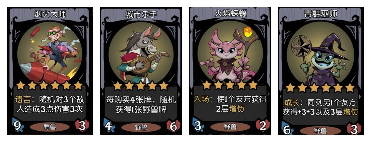 最后,推荐一下野兽种族的烟火大师流派的玩法,这套玩法同样操作简单且强度在线。这套玩法总共分为俩类,一类是搭配城市乐手进行的野兽倒转,通过火焰蝾螈来为烟火大师刷取增伤层数。如果你不喜欢进行倒转玩法,那么另一种玩法通过青蛙巫师来为烟火大师成长增伤的速度也同样理想。以烟火大师为核心的阵容强度非常在线,是目前野兽阵营最为主流的上分阵容。