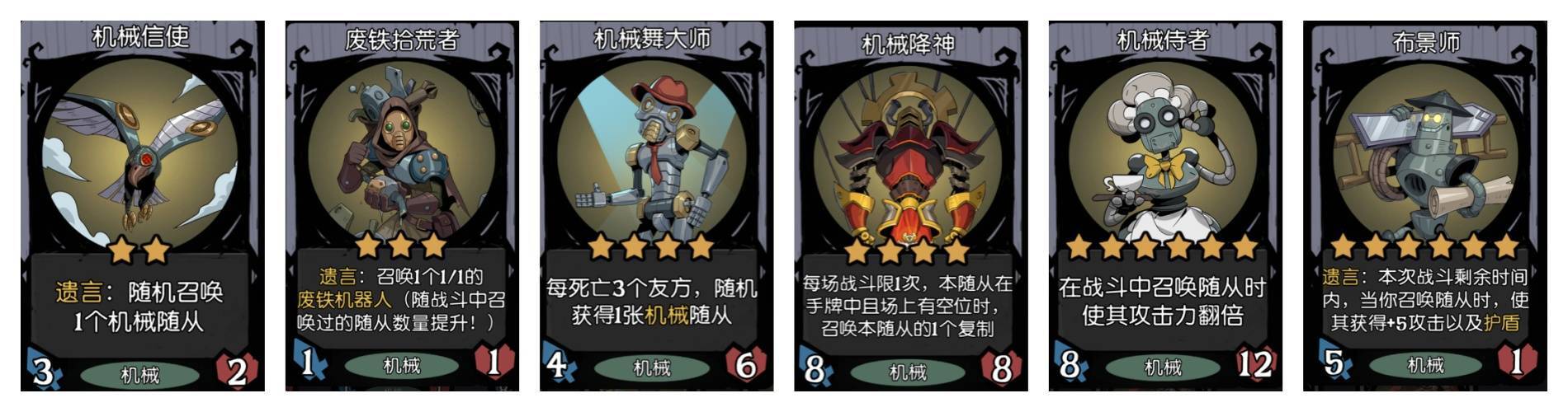 新赛季在阁楼模式的机械种族新增了大量的新随从,其中新增的随从机械信使、废铁拾荒者、机械舞大师、机械降神、机械侍者和布景师都是能够和召唤流搭配的随从,再加上未被删除的钢铁多头蛇、遥控机器人、机甲先锋等随从,召唤流玩法在新赛季非常值得尝试。这其中机械降神可以在不占据场上格子的情况下还能在有空位时召唤1个,金色更是召唤2个。而布景师更是能够为全体召唤物提供护盾,这些新随从的加入大大提升了召唤流的整体强度,让召唤流不再沦落为末流阵容。