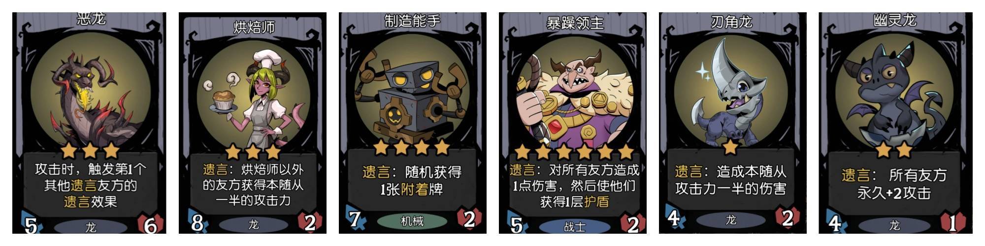恶龙可以搭配的遗言随从有很多很多,这里盘点主流的几种搭配。首先是烘焙师,恶龙搭配烘焙师加咆哮巨龙等随从的组合是一种适合在中期过渡期间使用的一种阵容。然后是制造能手,恶龙搭配制造能手可以稳定的产出附着随从,附着流玩法中期的过渡阵容。恶龙同样可以作为工具随从,搭配盾战体系的暴躁领主来刷盾,如下图所示,这是现在越来越流行的一种玩法。