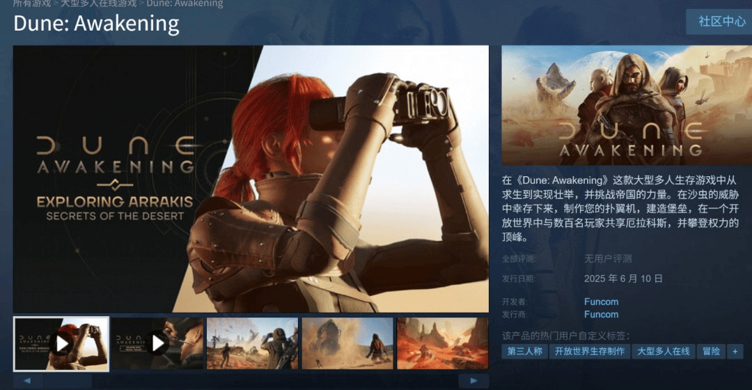 Funcom宣布开放世界生存网游《沙丘:觉醒》PC(Steam)版跳票,从原计划的5月20日延期至6月10日。玩家最早可于6月5日抢先体验游戏。