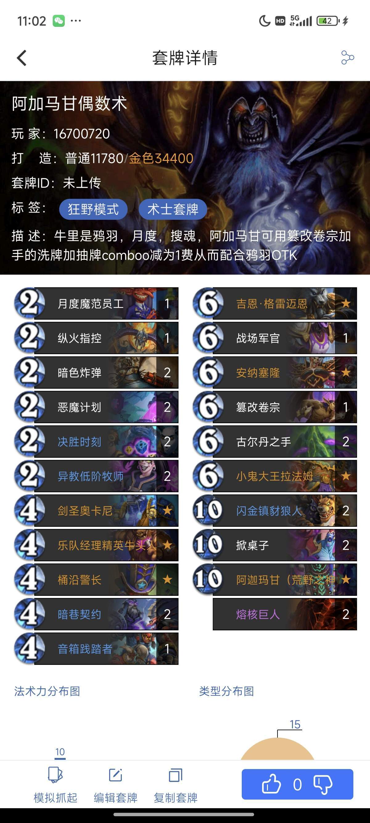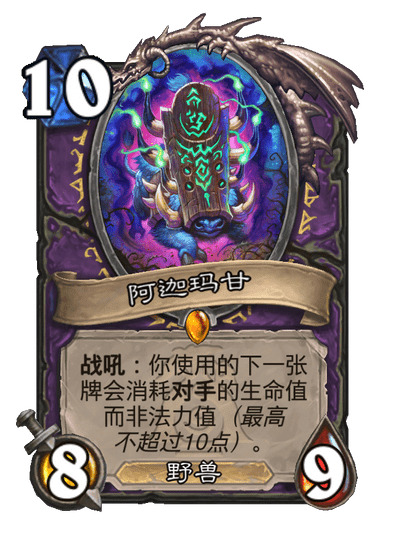 起初是我和朋友痛骂圣契骑,然后我们的话题转到了他最近正在玩的宇宙术上,于是我们就顺其自然的把话题转到下个版本术士要出的橙卡阿迦玛甘,这张卡之前在社区也有一定的讨论度,大家大多数讨论的是他与鸦羽配合的50血otk斩杀,于是我当时也是灵感迸发,也以大家的思路为基础,想出了这一套外加阿迦玛甘的偶数术体系预构筑。