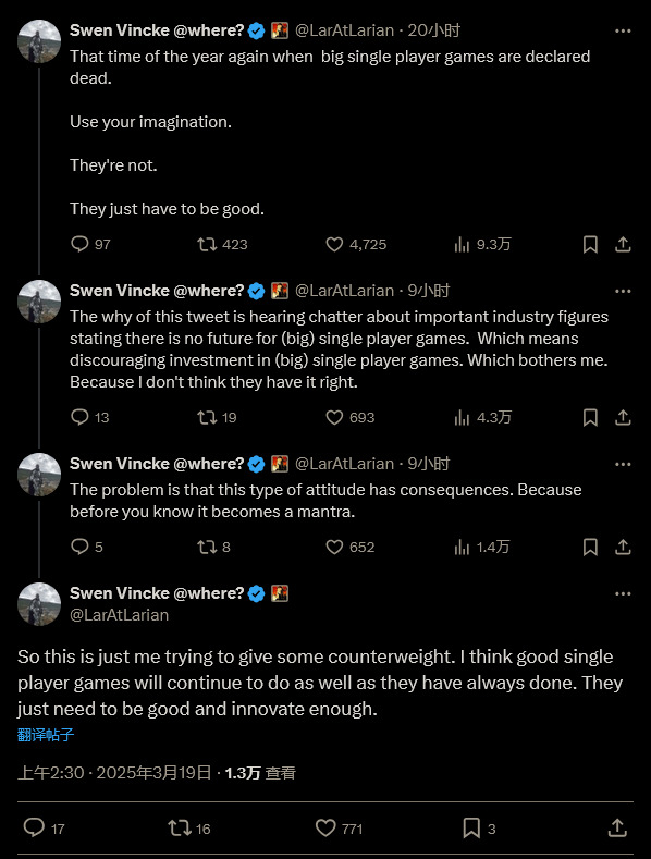 Swen 后续解释道,自己之所以突然发表意见,是因为他听到一些业内重要人物又在宣告大型单人游戏“没有未来”:“这意味着不鼓励对大型单人游戏的投资。这让我很困扰。因为我觉得他们说的不对。”