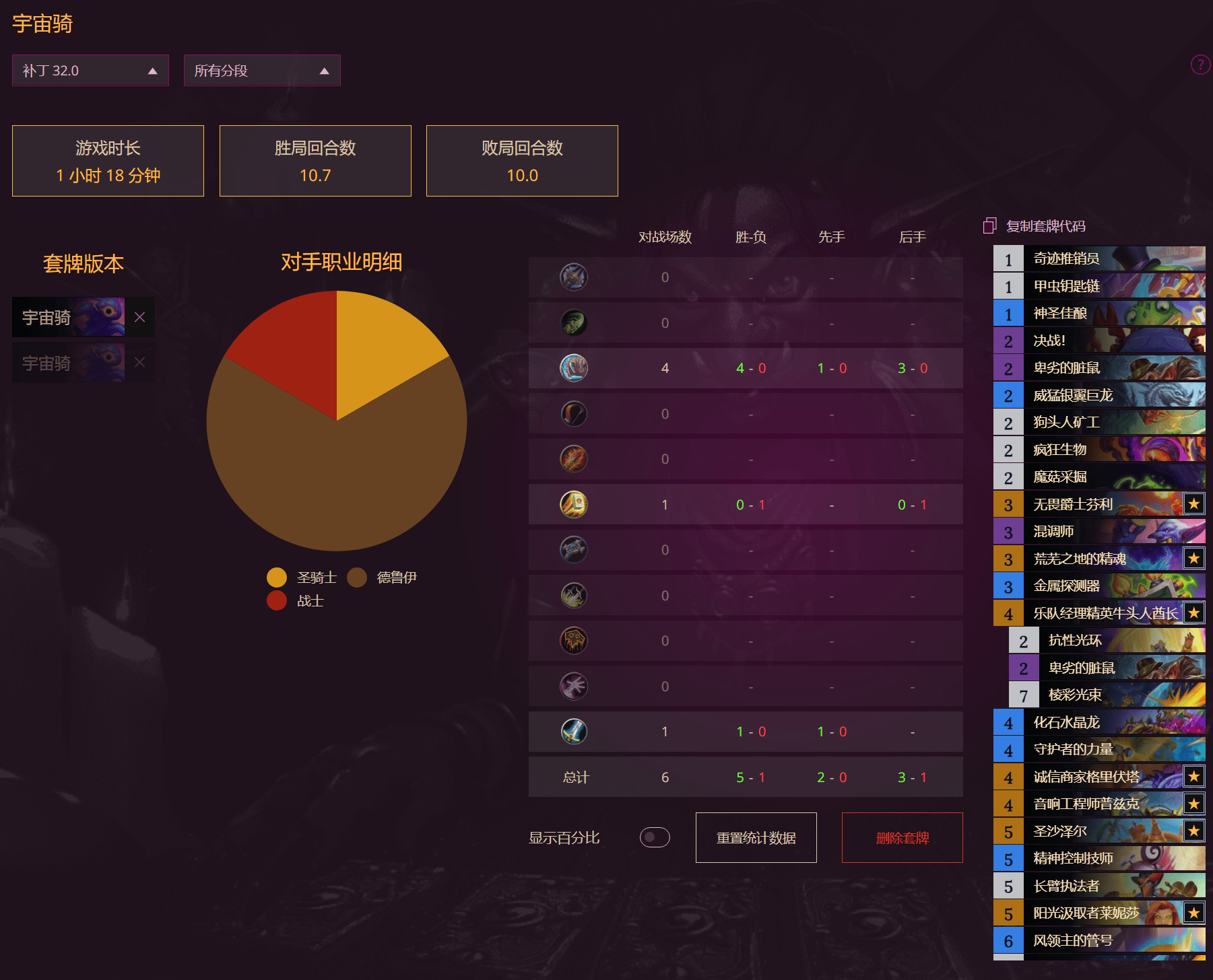 棱彩和决战的回归,4费守护者力量使得骑士的前期解场能力爆增。以德鲁伊为假想敌,凭借这几张超模低费解场能处理掉德鲁伊第一波攻势,并且返场。拼到高费之后我们有雷诺,沙龙,空宇,泰坦,风怒刀等空场手段。我自己的号也是从860打到了600名。对战德鲁伊也是极高胜率。(因为打了乱斗,天梯没打多少样本可能太小了,但一共就一周,没时间提供大样本了)。