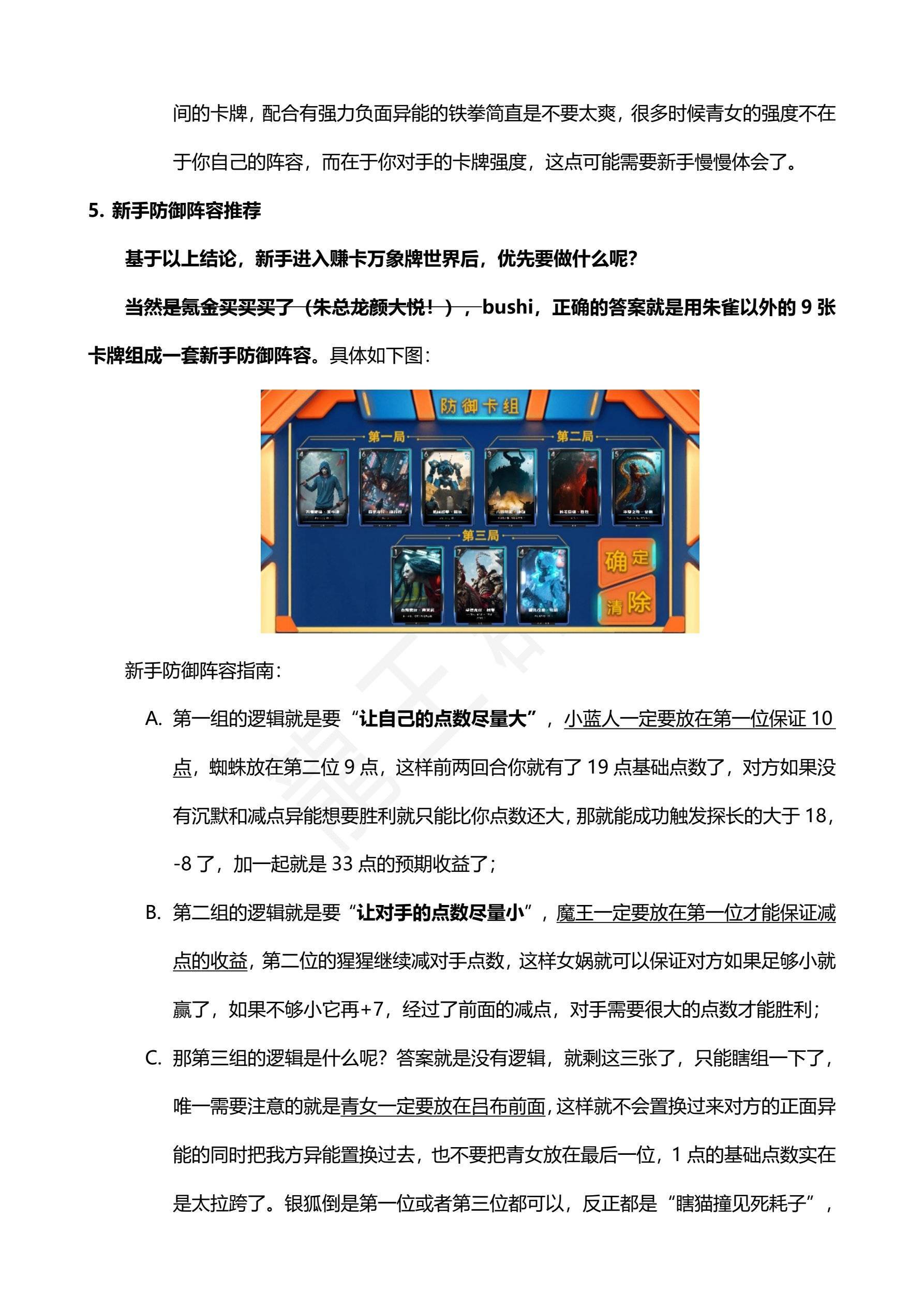 - 这三组的顺序可以随便调换,但是尽量让前两组在前面,因为第三组实在是有点弱,当然了,放在前面也可能会消耗掉进攻者的强力卡牌,为后面奠定胜局,博弈无处不在,与人斗其乐无穷。