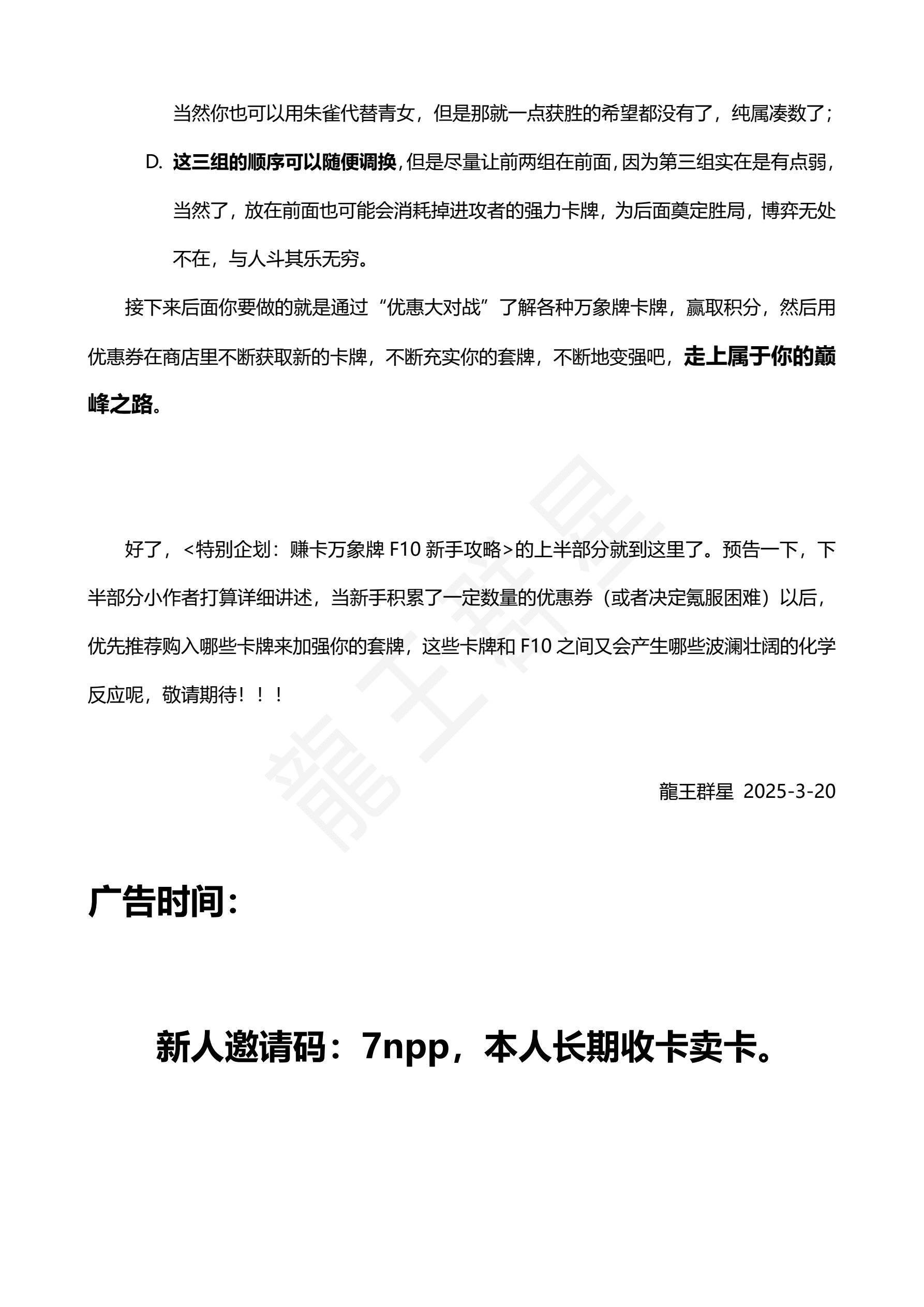 好了,<特别企划:赚卡万象牌F10新手攻略>的上半部分就到这里了。预告一下,下半部分小作者打算详细讲述,当新手积累了一定数量的优惠券(或者决定氪服困难)以后,优先推荐购入哪些卡牌来加强你的套牌,这些卡牌和F10之间又会产生哪些波澜壮阔的化学反应呢,敬请期待!!!
