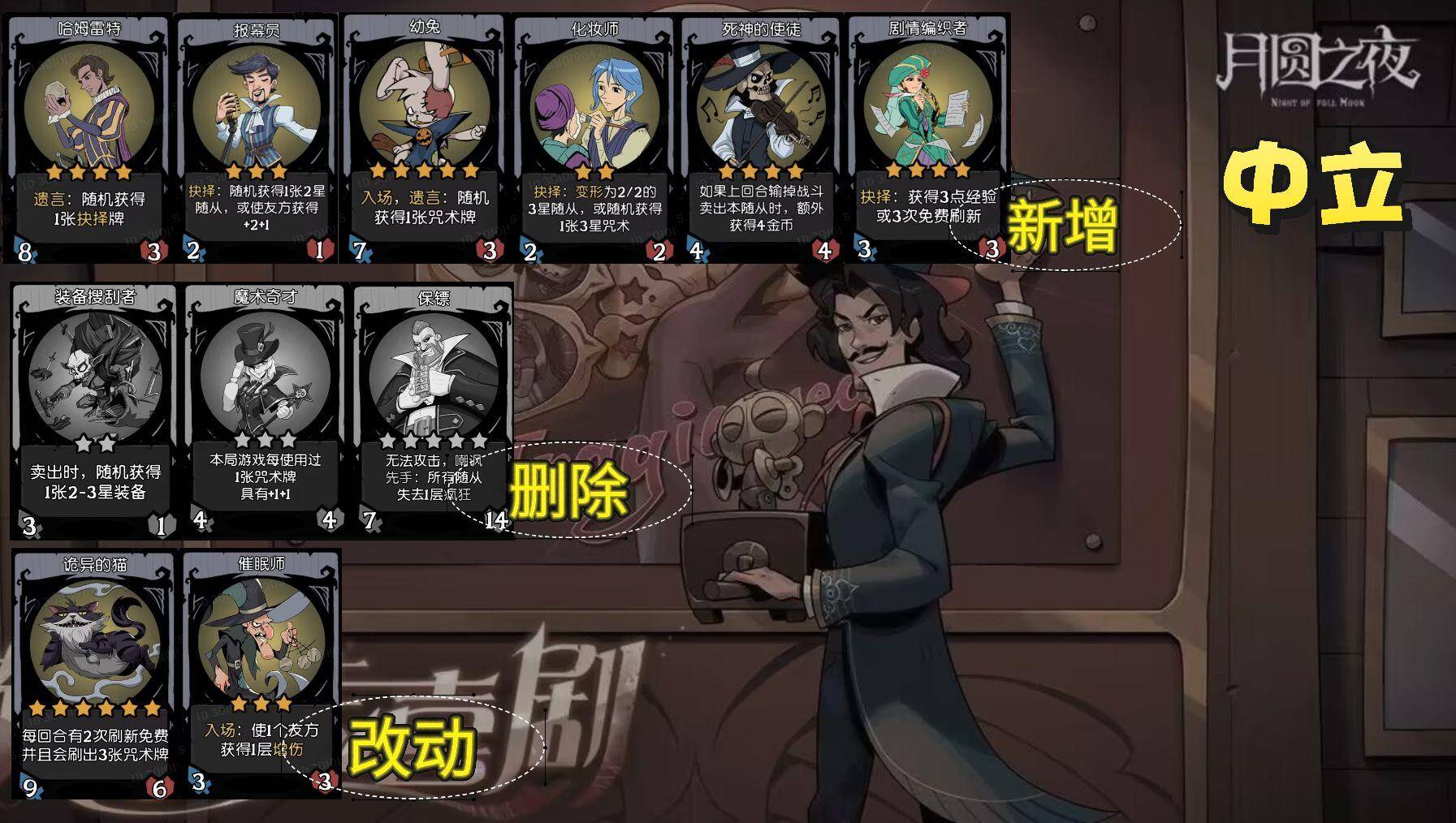 诡异的猫升到六本属于是加强了,三连如果其他两张不好还能选择诡异的猫看一下咒术,而且S7赛季大多数的咒术都是核心,加快自己的运营节奏很关键!催眠师前期给1增伤还比较好用,后期也起不到太大作用,合理改动。魔术奇才在大部分情况下都是用不了的,也稳不住,删了也没问题,可惜保镖这个后手的关键对策了,不过下赛季的双英雄机制大多是神仙打架,单靠对策可能起不到太大作用。