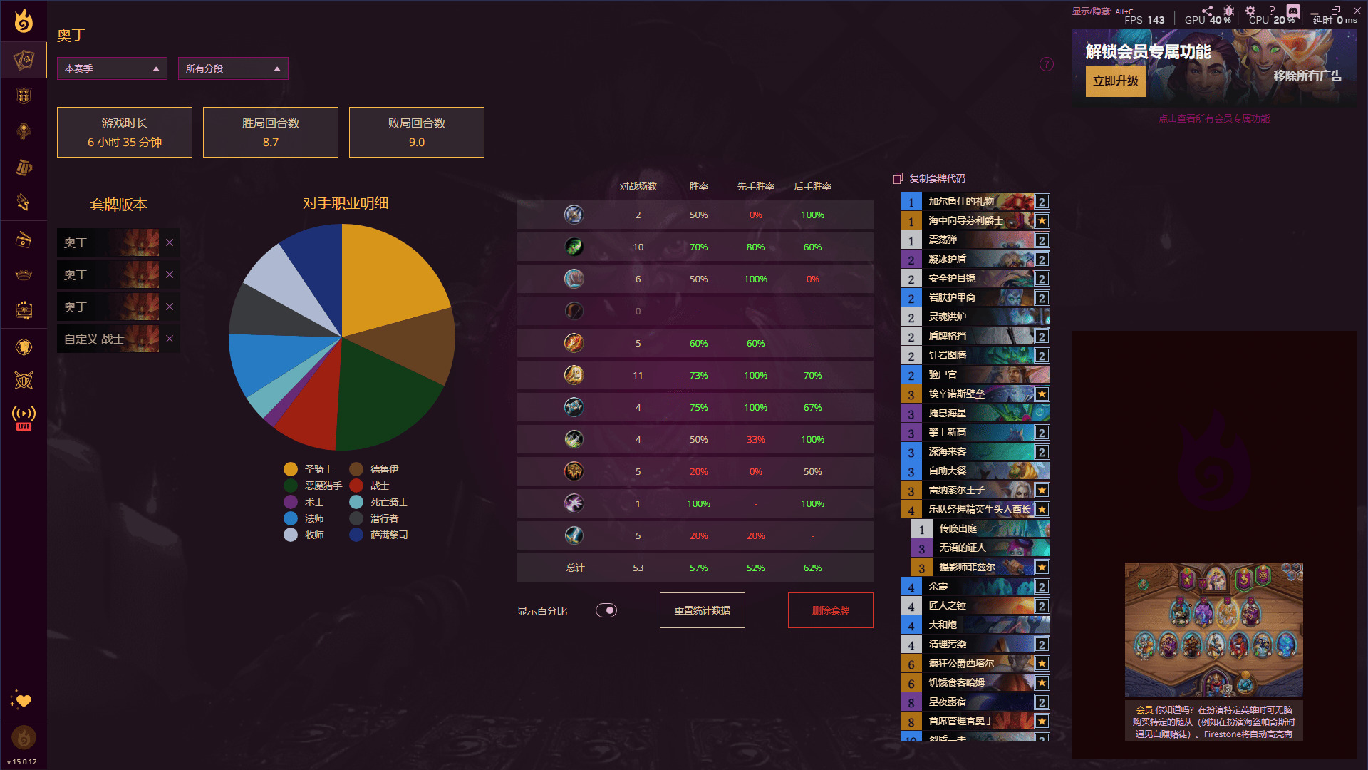 上个月使用钩牙,龟法交替月结400左右, 这个月月初用龟法打了两把输了之后就没再摸过狂野,遂转战标准,昨天看到好友(炉石IDcloser)使用自组奥丁战极高胜率上了传说于是来了兴趣(当然有一部分原因是因为我王子和铜须皮肤好久没用过了)于是找他要来卡组并进入天梯(开始坐牢),在此感谢closer的指导,没有他的指导,我没法这么快上手这套卡组,之后就是打了(坐牢)两天,毕竟排一把两三分钟真的很折磨,当然最后我坚持了下来,并且418 上传,感觉这个卡组可以发出来抛砖引玉一下,并且附上对局情况仅供参考(分段不同对局情况大不相同)