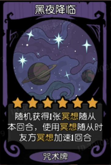 黑夜降临,可以随机获得一张冥想随从牌,重点是本回合使用冥想随从时,友方冥想加速一个回合,相当于在这个回合内给你提供一个白的黑夜使者,这张牌不仅仅是在你没有黑夜的时候救你的命,在你有一个白黑夜但黑夜不是金色的时候,你打这个咒术,也能临时让你的黑夜变成金色为你省下一个格子,所以,这个咒术绝大部分时间都是很有用的。