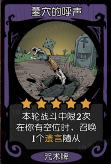 四星的就到这里,我们来看五星的,首先墓穴的呼声:本轮战斗中限两次,在有空位的时候召唤一个遗言随从,在有空位时召唤一个随从对于遗言召唤流来说,因为不会卡格子,所以是一个很香的效果,但是这种效果如果只生效一个回合而不能够长久的拥有他的话,感觉怪怪的。