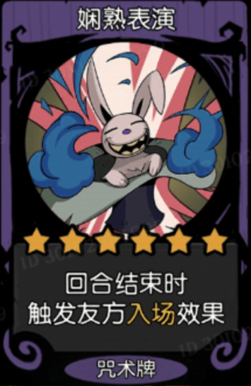 娴熟表演:可以在回合结束时触发友方的入场效果,一般来说,到了6星不会在回合结束时,在场上专门留一个入场牌来配合他,就算配合到了,那么收益估计也很一般;