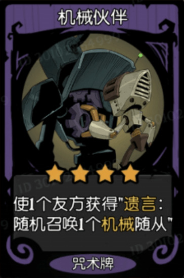 3星以下没有新咒术了,4星的咒术有一个机械伙伴,使一个友方获得遗言随机召唤一个机械随从,这对遗言召唤流来说是一个大加强,因为随机召唤一个机械,他有相当概率可以再次召唤。