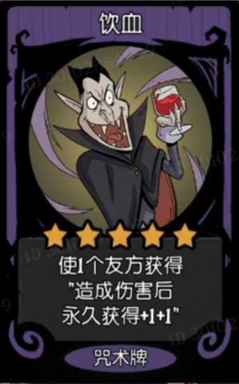 饮血能让一个友方获得造成伤害的时候永久获得加1+1,这就是吸血鬼剑,因为自伤流已经噶了,所以这个咒术基本只能给野兽的增伤流使用了,也就是那个猴子:遗言对3个敌方随从造成3次3点伤害。