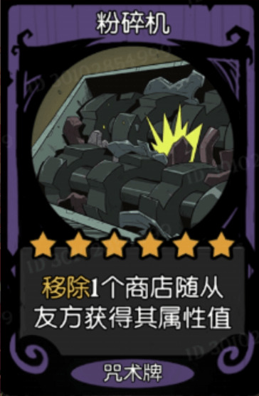 粉碎机:移除一个商店随从,友方获得他的属性值,一般来说,获得30-40的属性值是没什么问题的,反正作为六星咒术,他提供的属性值都是合格的,如果说他不行的话,可以参考以前的宝石。