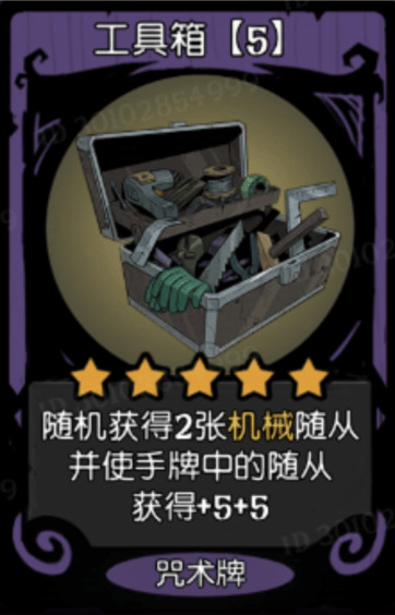 工具箱随机获得两张机械随从,并使手牌中的随从获得加5+5,这个加5+5可以配合机械降神,不过大部分时间他就是获得两个随机的机械随从,这显然就不如随机获得两个抉择或者两个入场牌了,他还有一个六星的版本,能获得三张机械随从,不过基本都不会选。