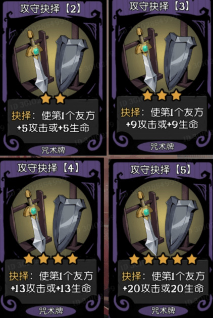 阵型切换比较类似是全场加攻或者全场加生命值,这个数值就比较保守了,是3-5星的咒术,顺带一提,抉择的咒术也能够触发抉择卡牌的效果,比如说同时拥有两种效果,抉择触发两次,或者在你下一次刷新必出3张抉择牌的时候,也有概率刷出抉择咒术。