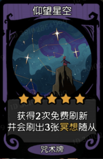 仰望星空的原画很漂亮,是小红帽站在山巅仰望星空,效果是获得两次免费刷新,并且会刷新出3张冥想随从,这张卡不是给你升五本的时候用的,而是现在双生占卜书回归了,那么星裔倒转的时候就能获得大量的高星咒术,这时候给你随机到了两个仰望星空,你有多舒服,这个大家玩过星裔倒转的都懂。