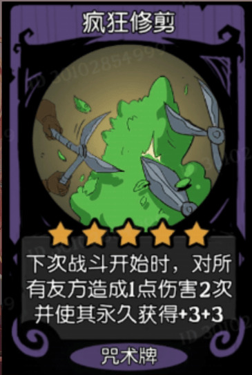 疯狂修剪能在下次战斗开始时,对所有友方造成1点伤害两次,并使其永久获得加3+3,这就是自伤流的一个组建吧,但是现在自伤流已经被削的狗都不玩了,南瓜王和仙人掌两大核心全都没了,所以这个咒术也没人拿。