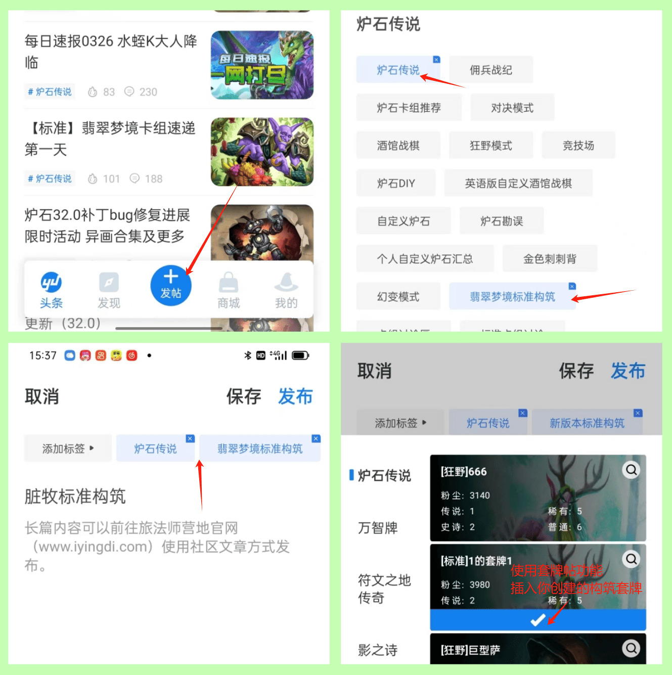 在旅法师营地App内,点击发帖按钮,选择相应的游戏板块# 炉石传说,并添加# 翡翠梦境标准构筑 活动专属标签下。