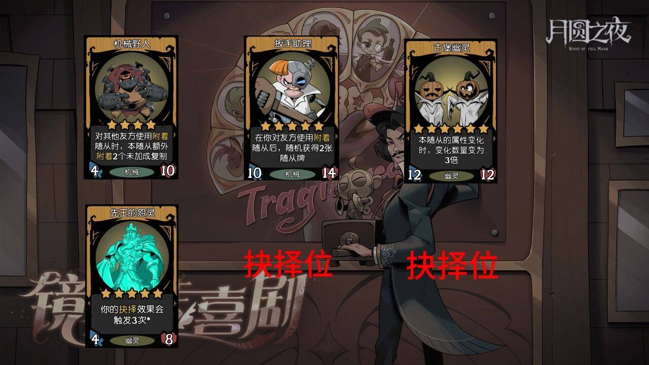 3.记住每一张抉择牌的选择位置,例如亡魂商贩获得亡魂附着在右边,无头骑士获取幽灵牌在右边等,这个需要大家勤加练习形成肌肉记忆来提高效率。不仅左右位置需要记住,抉择的时候还要将两个选项的大概位置形成条件反射,打出抉择牌时将手或鼠标提前移动到键位上达到看不清抉择选项就已经选完的程度。