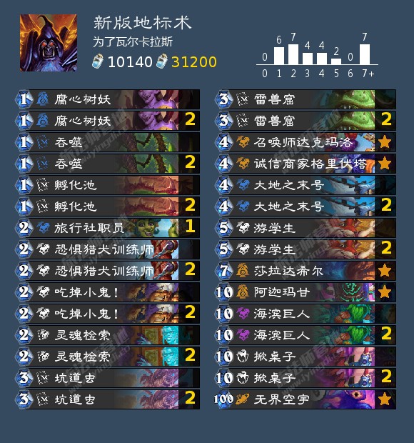 21场80%胜率,还是有点含金量的。说几个改动:不带女王,提高坑道虫检索到key牌的概率;加入莎拉达希尔补充伤害和资源;猪神提供无视护甲的斩杀。灵魂检索作用很多,复制巨人铺场,莎拉达希尔打资源,猪神斩杀等等。