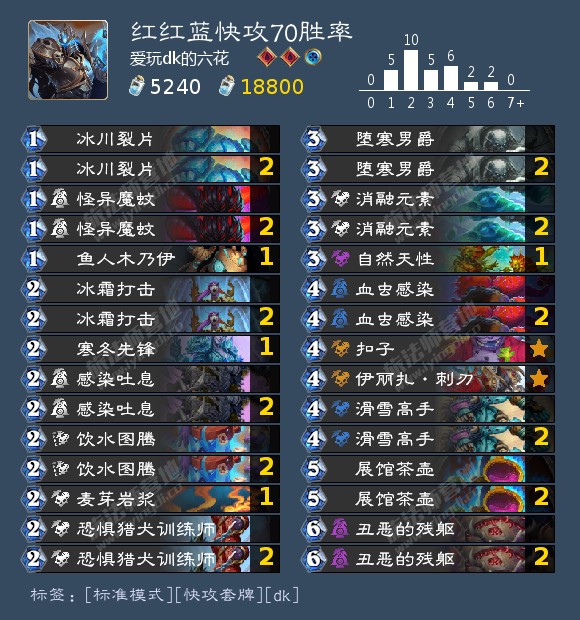 一套看上去很不靠谱但实际相当有强度的dk快攻(没错dk在快攻)而且甚至是红红蓝,战场能力极强,蚊子和图腾的强力buff以及萨满的338消融元素强力嘲讽持续buff站场,更有后手1跳币冰片双滑雪44天湖起手,套牌中大量种族也可以被茶壶buff急剧场功,胡的情况5费结束,舰长的加入也让水蛭有了一定战斗力这套牌主要在起手留牌上比较讲究下面是几种起手情况。
