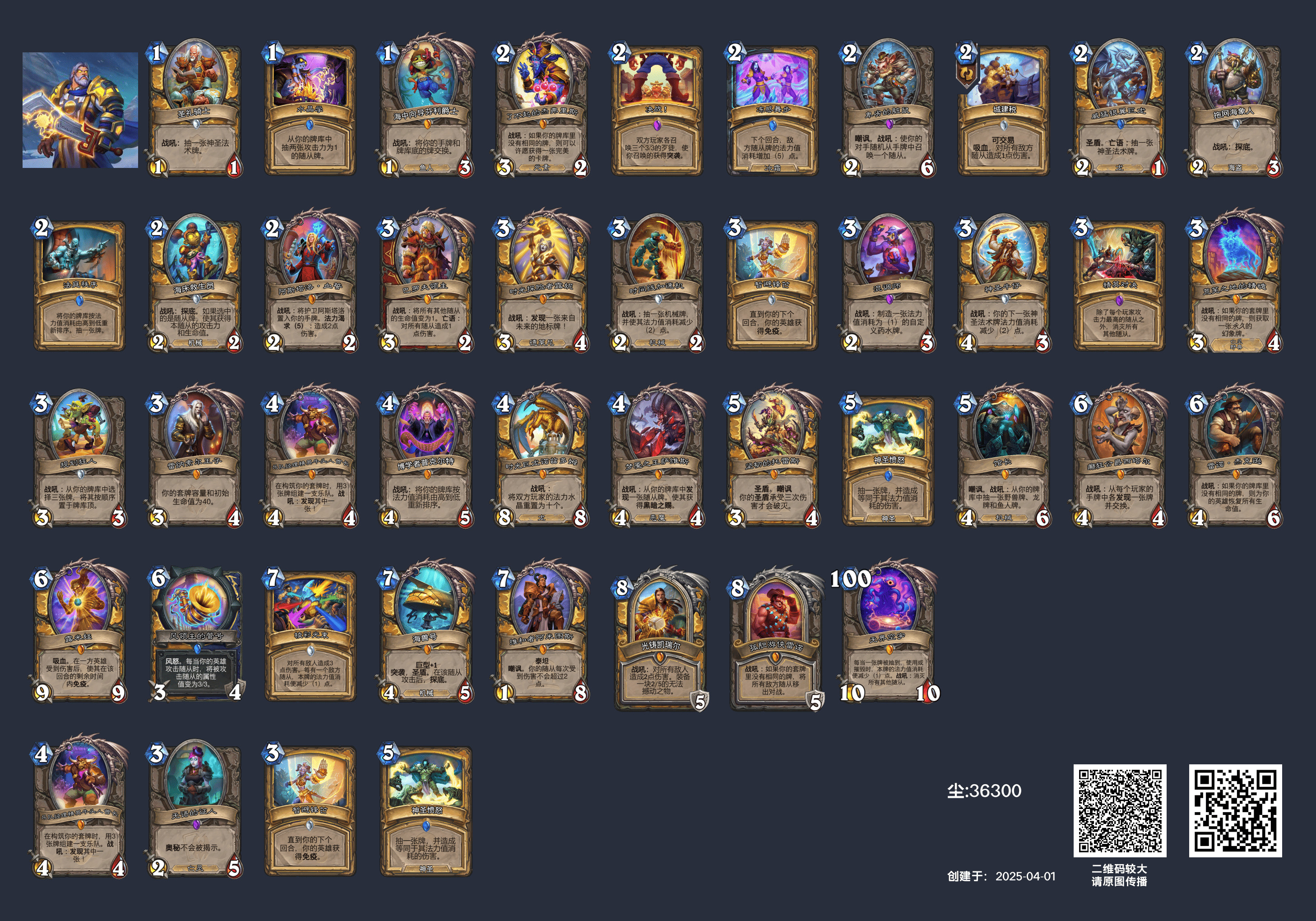 这套宇宙战是走进攻的,没带萨隆苦囚+维伦,流亡者领袖的无限维伦思路,也没办法稳定叠百甲。卡组亮点在于,神铜须之后钢铁战蝎单卡能贡献30点伤害,配合发明家砰砰的复活很少有职业能扛得住。特别是在打法师这种有冰箱的职业的时候,这是为数不多能威胁法师生命的牌。