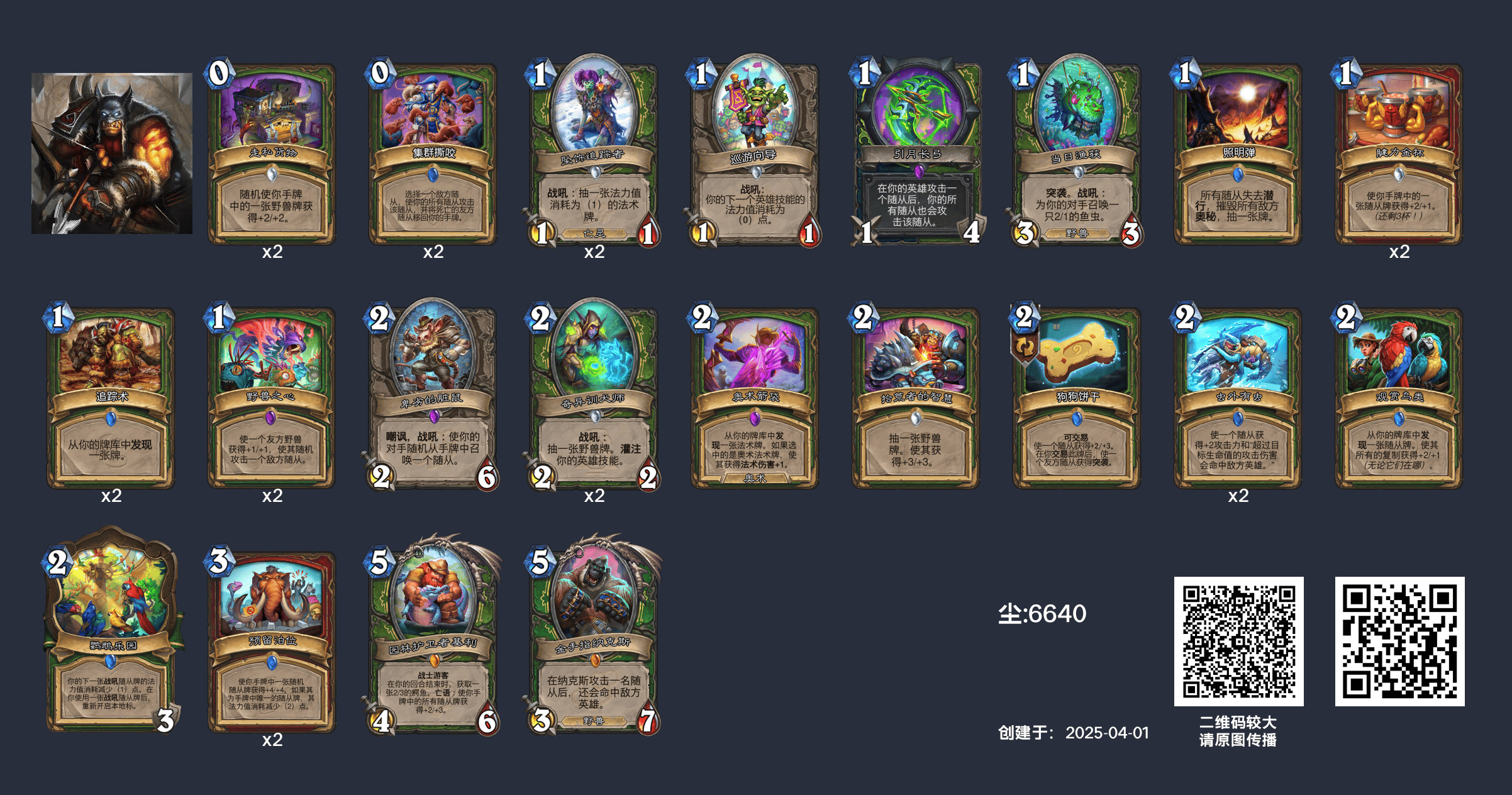 来自白芝的中速猎,他使用这套卡组在月榜划水,我使用这套卡组以24-5打进了月榜。