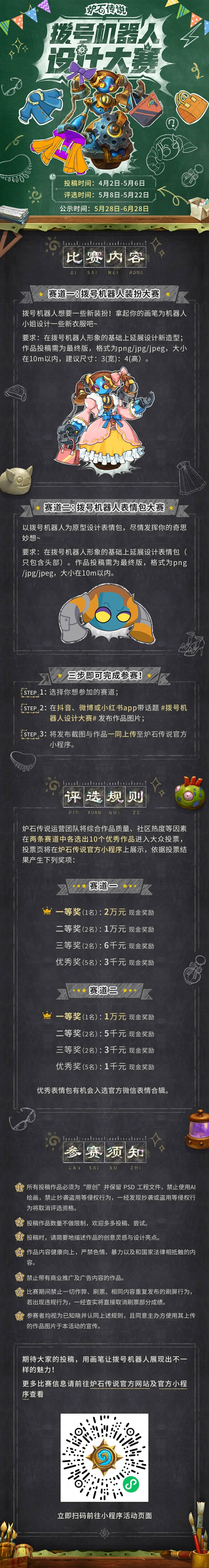 炉石国服今天发布了又一个美术类社区活动,以去年在国服格外走红的拨号机器人为主题,征集“换装”和表情包设计。不同于之前两届更正式的美术设计大赛,这次作品不进游戏,但其中的表情包也有机会进官方微信表情合辑。