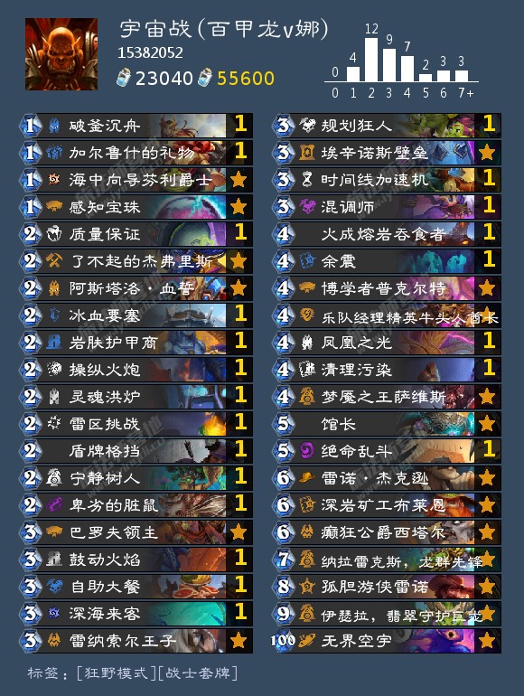 战吼萨:劣势,对方对手牌的破坏能力过强,虽然打了几把都赢了但是非常惊险。值得注意的是现在萨满滤抽也非常快,工头的效果会比之前好很多,原初地下城历险家很容易内鬼。