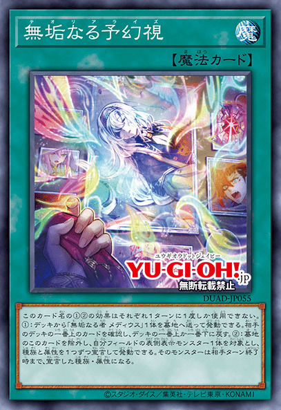 ①:从卡组将1只「无垢者 梅迪乌斯」送去墓地才能发动。将对手的卡组最上方的卡确认,回到卡组最上方或最下方。