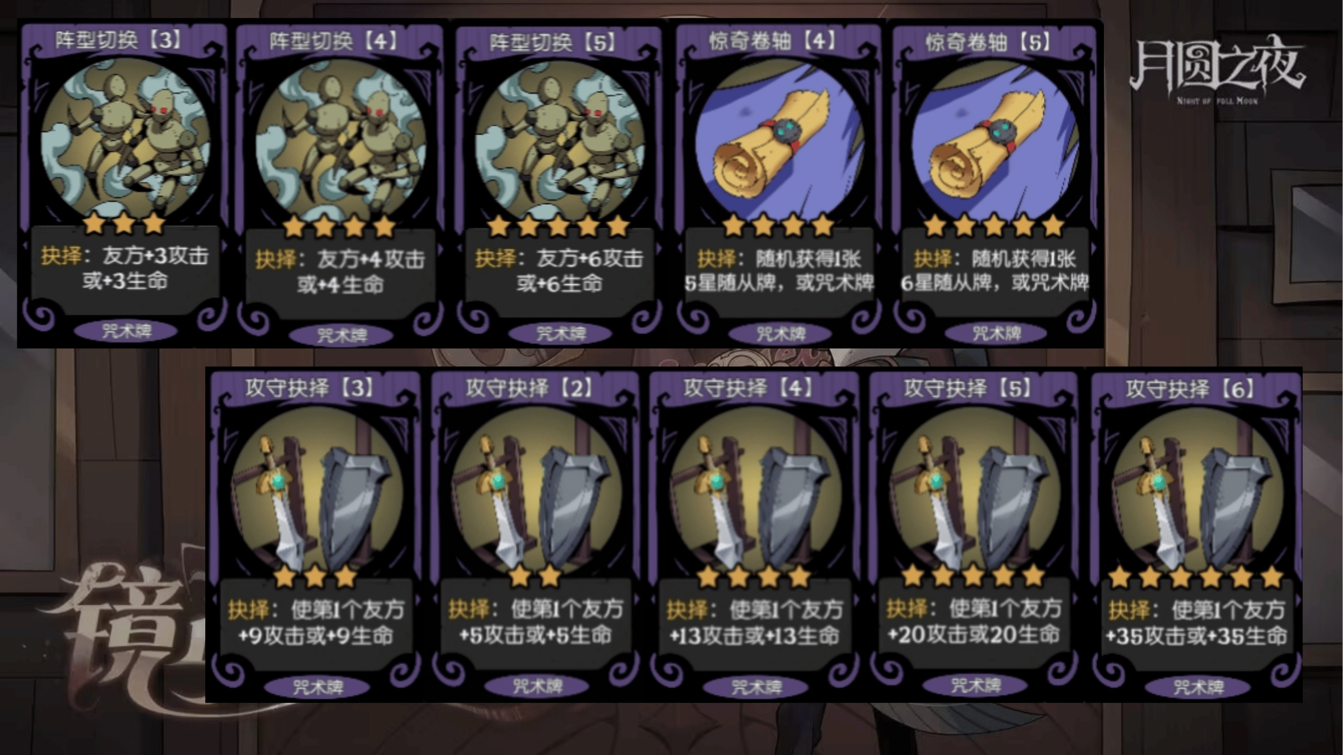 ②阵型切换系列:全体加攻击或者加血量。花钱买一定不要,三本的上本咒术大部分选经济也不会选择这张咒术,可以说整个系列都没什么作用。