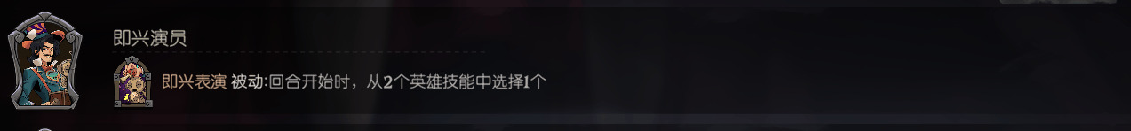 即兴演员是被动效果,效果是回合开始时从2个英雄技能中选择1个,开局没有额外金币。