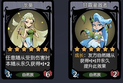 自然种族最常用最主流的阵容有俩个,对应是自然种族的俩个主流玩法——自伤流和成长流。相比与之前赛季,自然种族的买卖流已经没落,且成长流和自伤流玩法相比之前赛季也有了非常大的变化。这些变化归结于新赛季更改的俩个核心随从——龙葵和甘霖灌溉者,这俩个随从的强度目前足以支撑起一套玩法的形成。