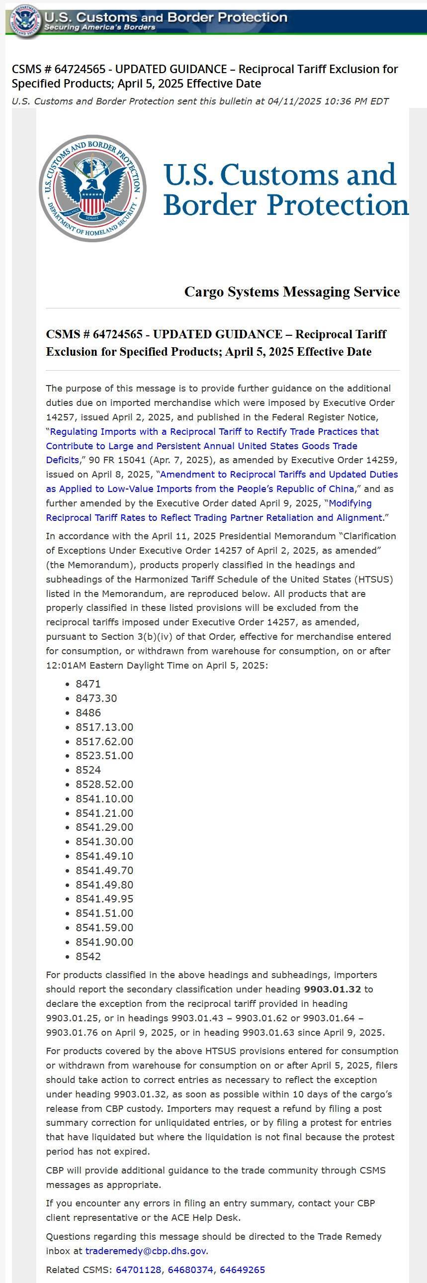 据国内媒体报道,当地时间4月11日深夜,美国海关与边境保护局发布公告称,根据美国总统特朗普当天签署的备忘录,包括智能手机、路由器以及部分电脑和笔记本在内的一系列产品将不再被纳入此前针对中国进口商品实施的125%所谓“对等关税”范围内。