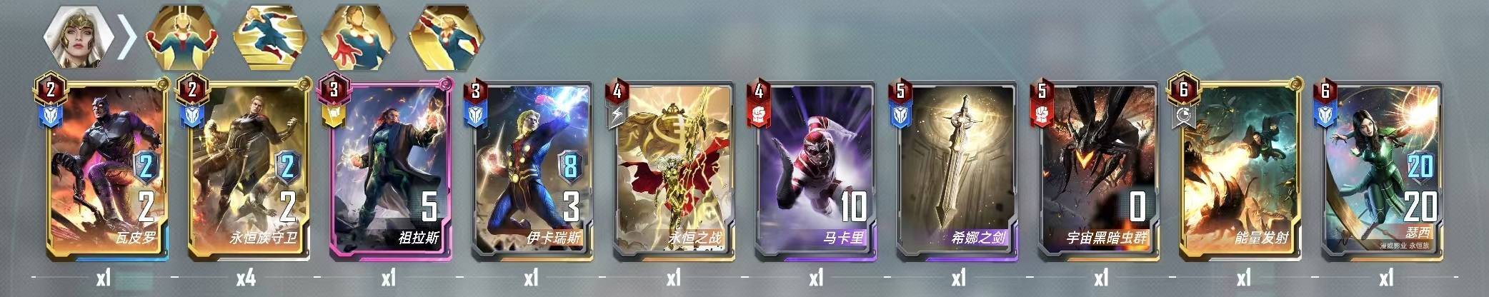 - 5费:界美队x4,至少3张,后期保证牌库有2张即可。美队盾x1,给泽莫防止战争机器美团,同时尽量摧毁小黄人和九头蛇等快攻的低费高星随从,减少被入。