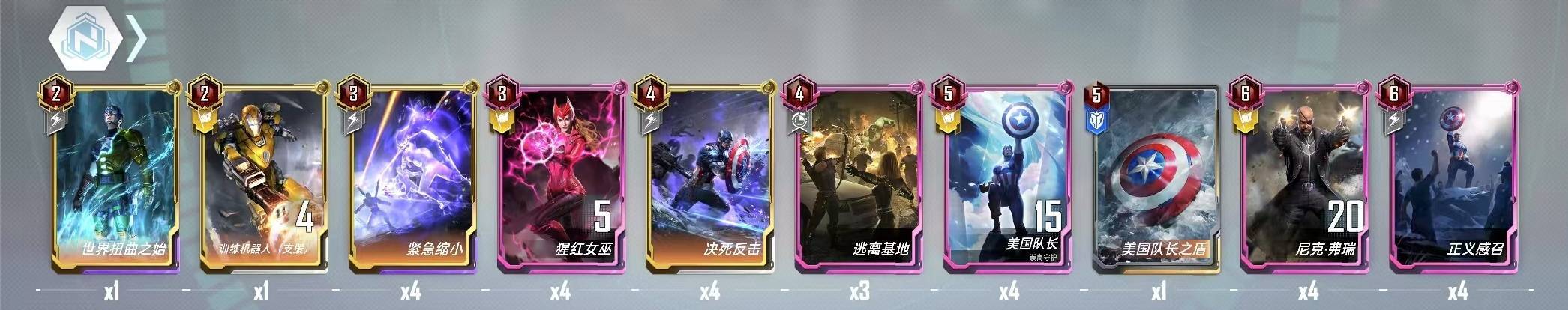 - 6费:界局长x4,核心中的核心,需要适当滤牌保证局长尽可能给界正义感召。界感召x4,需要注意它的牌库刷新逻辑,它会排除当前商店的所有牌进行一次刷新,即如果当前商店存在仅剩的1张美队,使用后商店并不会出现美队,需要再用一次感召。
