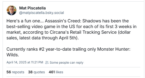 育碧旗下最新力作《刺客信条:影》在争议声中交出了一份亮眼的成绩单。Metacritic 82 分的评价和 Steam 平台的首发佳绩印证了其品质,现据 Circana 分析师 Mat Piscatella 提供的数据显示,该作自发售以来连续三周稳居美国游戏销量榜首,并迅速攀升至 2025 年全美销量第二位,仅次于卡普空的《怪物猎人:荒野》。