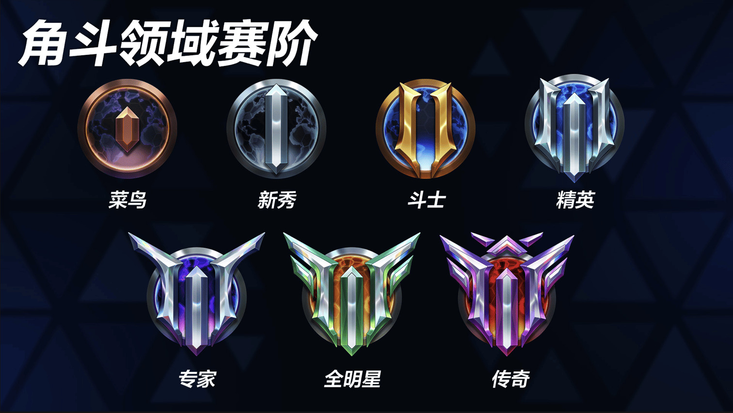 角斗领域拥有独特的排名系统,独立于常规的竞技比赛之外。考虑到新英雄、技能、异能系统及平衡性调整等因素,每个新赛季开始时,所有玩家的排名都将重置,统一从菜鸟赛阶开始。在角斗领域中获胜,将帮助你逐渐提升赛阶,晋级更高的分组。随着赛阶晋升,提高赛阶的难度也会随之提高,而失败带来的进度惩罚则会更严重。