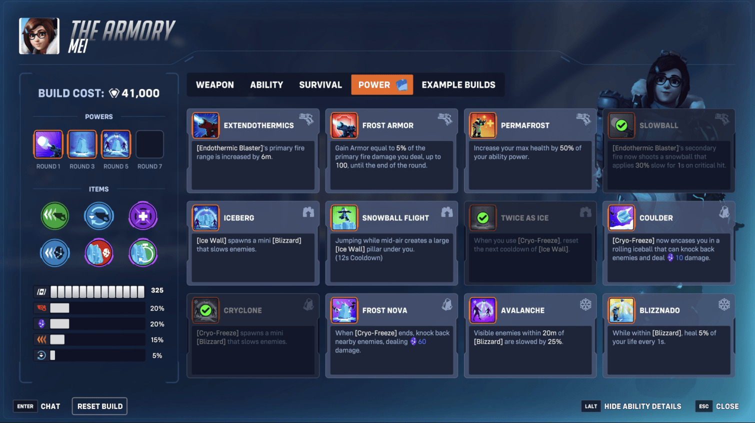 异能将赋予英雄独特的被动效果、技能强化或全新的技能。因此,装备特定的异能组合可以彻头彻尾地改变一个英雄的玩法,以特定策略出奇制胜。比如,莱因哈特的烈焰打击可以释放席卷战场的岩浆,雾子能制造分身迷惑敌人。装备异能不消耗角斗资金,但异能装备后不可移除,因此请谨慎规划。