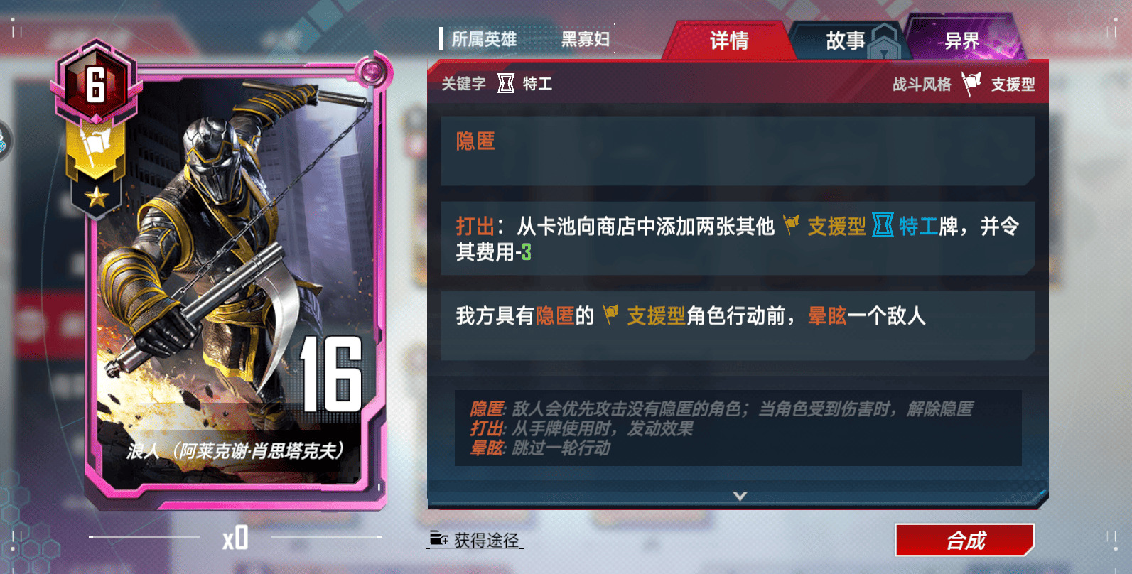 实话说,这张卡感觉加的攻击太少了,再有就是黑寡妇4费的位置很紧张,建议费用改一改,攻击再加多点,才可能有一定的出场率。