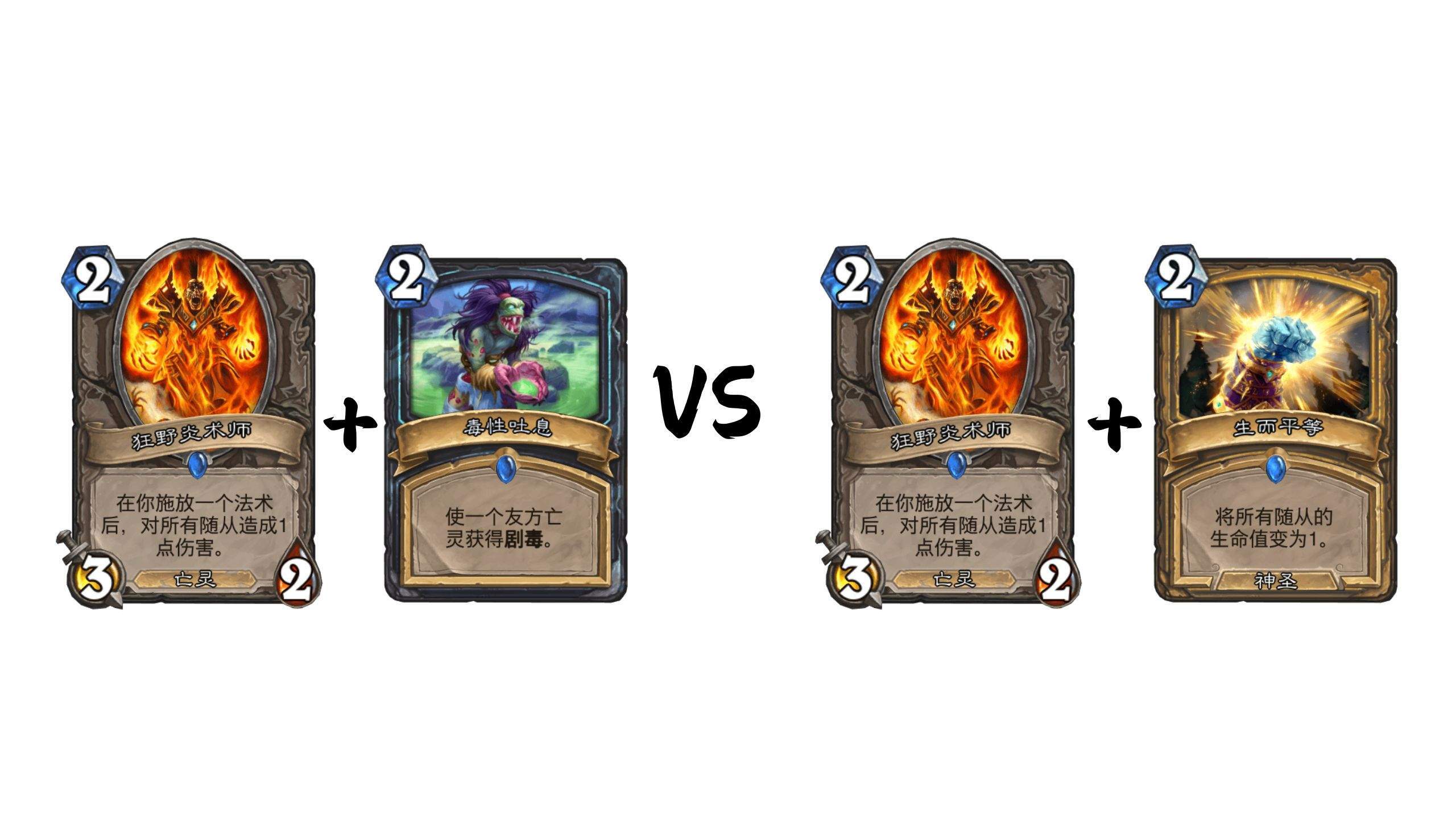 这两者之间看起来没有明显的完爆,但是在很多情况下会出现差异,例如像自动机这样在对方场上的持续buff生命值会让生而平等无法降到一滴血,导致炎术师无法全解,毒性吐息需要对随从施放获得剧毒在炎术师有魔免的情况下无法配合,而且对于对方有圣盾的随从时生而平等可以压低随从血线,而毒性吐息不行。