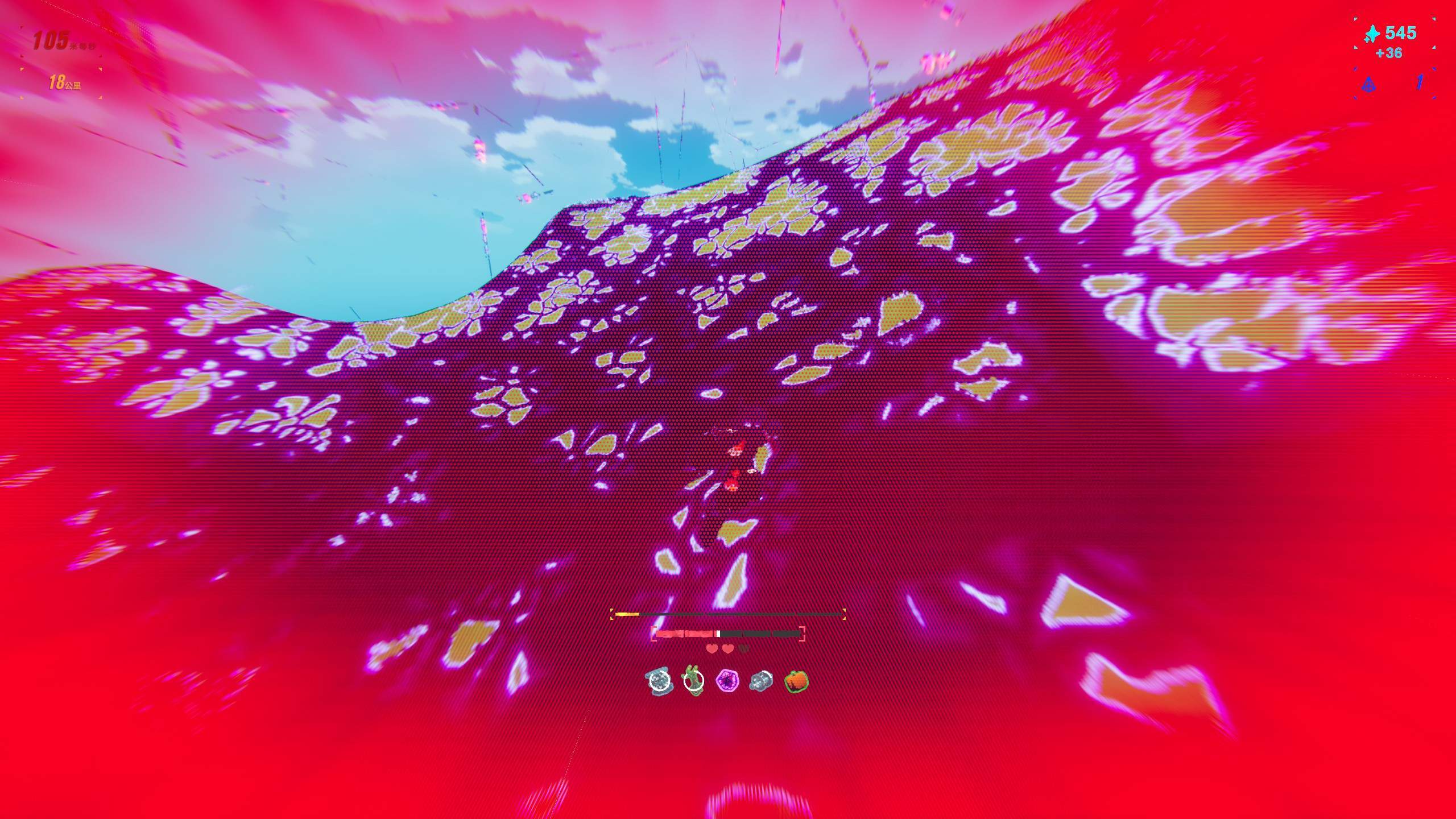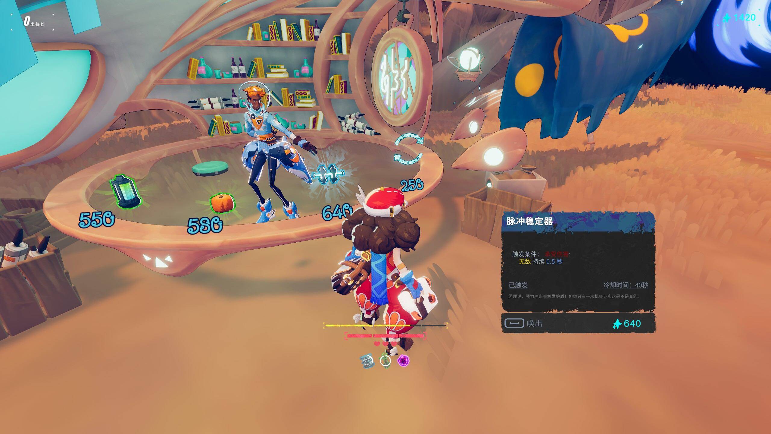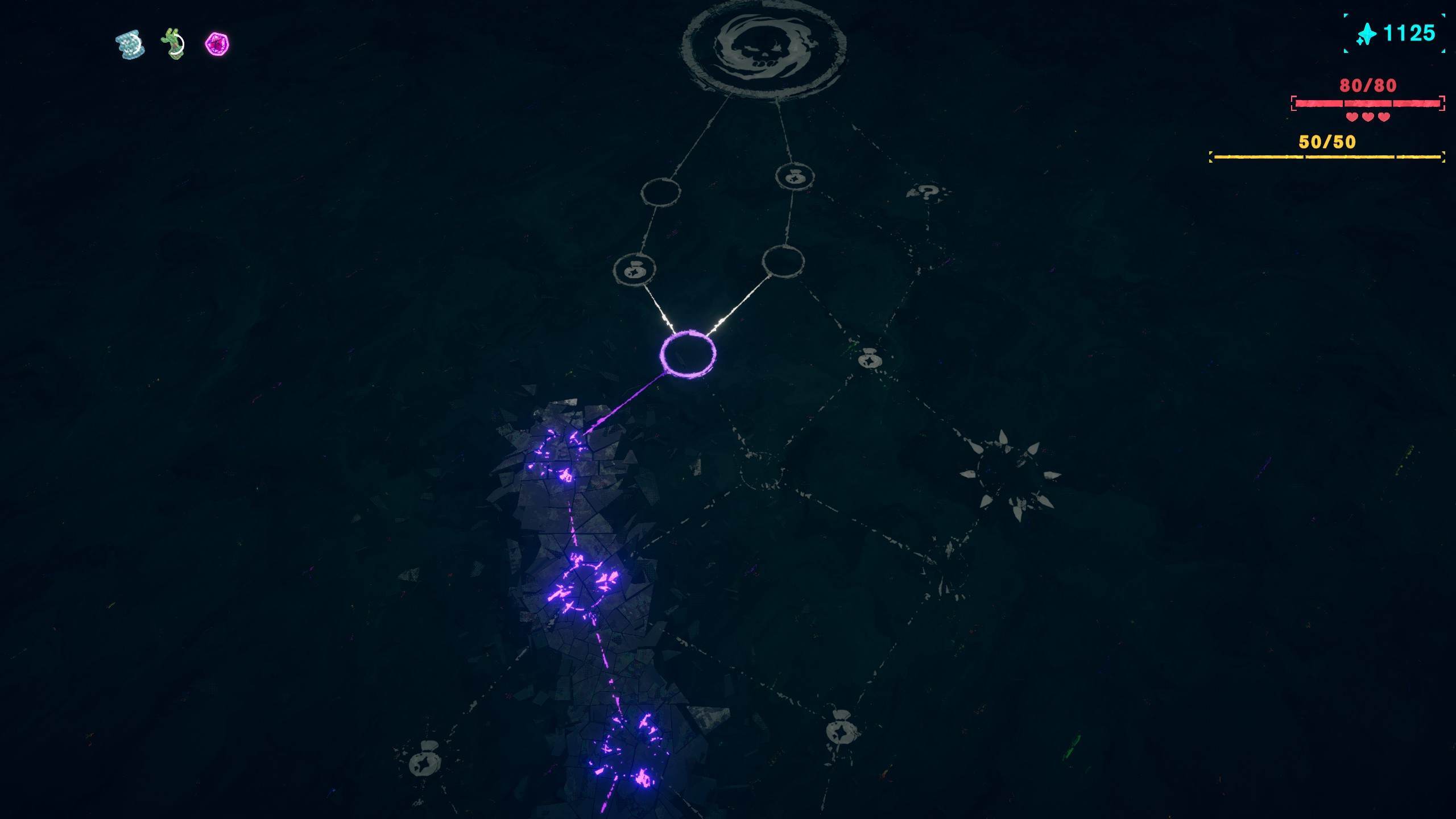 既然有了遗物系统,也就同样有了地图路线规划、商店等一系列地形,甚至根据地形复杂程度分出来普通和经营关卡。游戏中选择了优化操作容错作为其“肉鸽“的部分,大部分的遗物集中在提高玩家速度、减轻碰撞损耗,延长碰撞判定等内容,以一种比较柔和的方式控制了游戏中玩家的实时操作,代价则是一部分遗物或组合并不能实质改变玩家操作的结果,即游戏作为基底的跑酷部分始终占据了最大的成分。