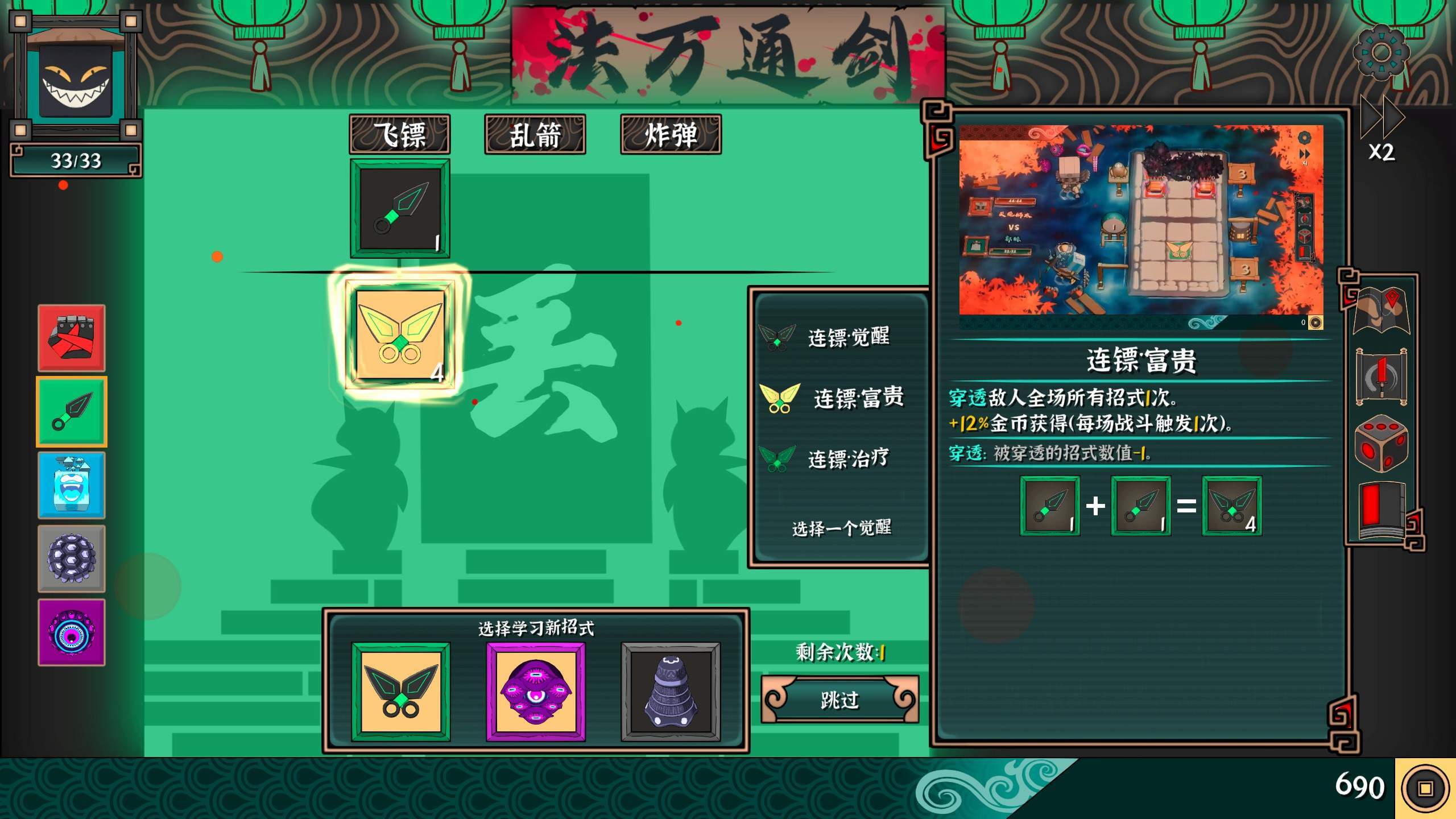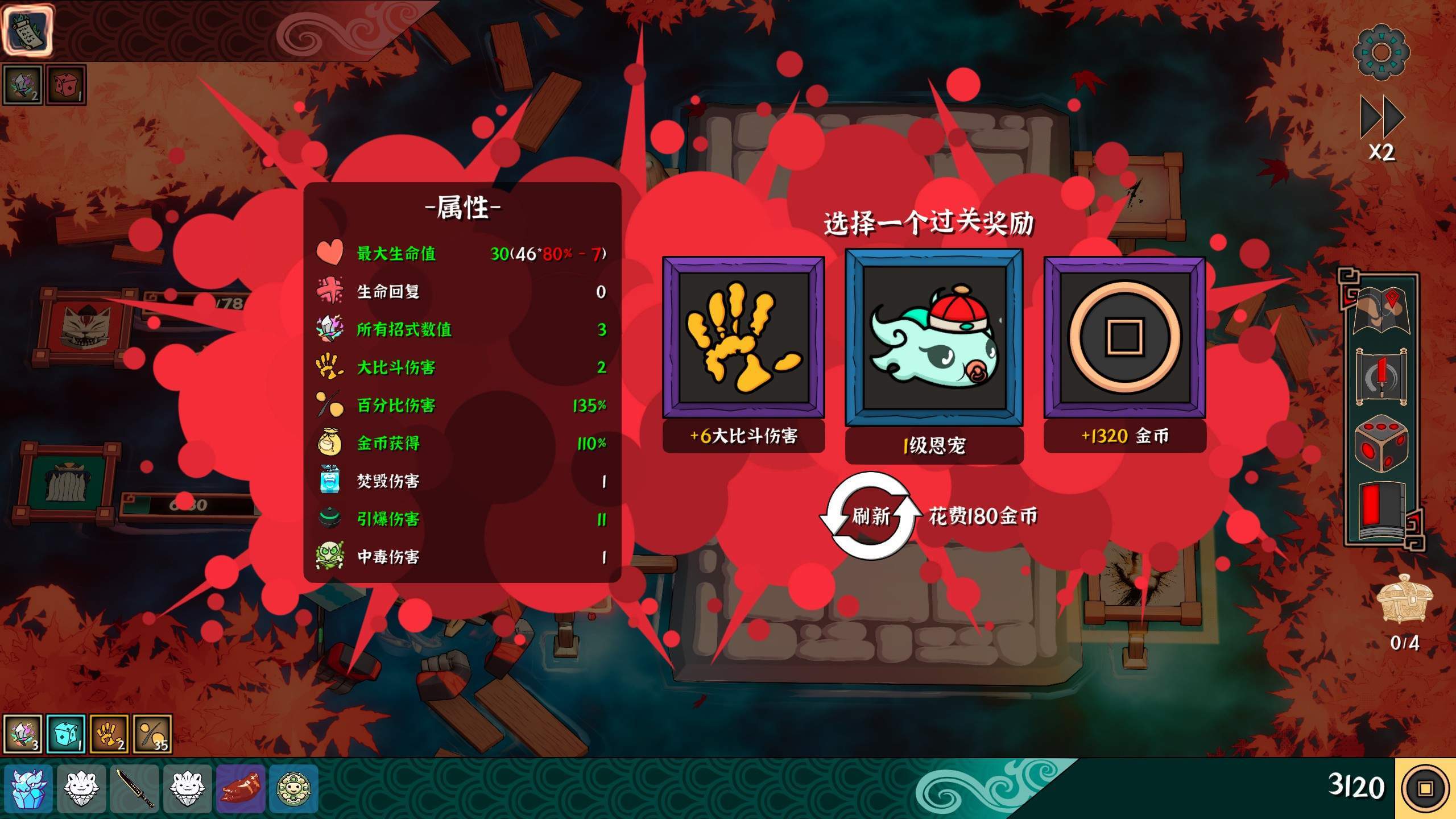在每一场战斗胜利后,玩家还能选择一次固定的3选一强化。此类强化包含了数值、金币、道具等等,也会比较清晰的展示玩家的属性数值。