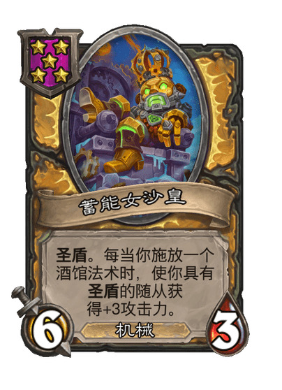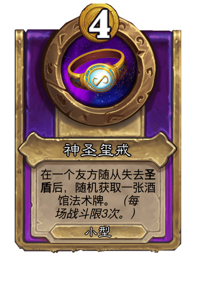 - [小型4费] 在一个友方随从失去圣盾后,随机获取一张酒馆法术牌。(每场战斗限3次。)