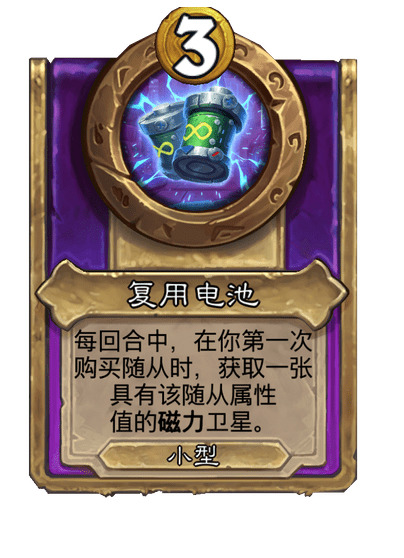 - [小型3费] 每回合中,在你第一次购买随从时,获取一张具有该随从属性值的磁力卫星。
