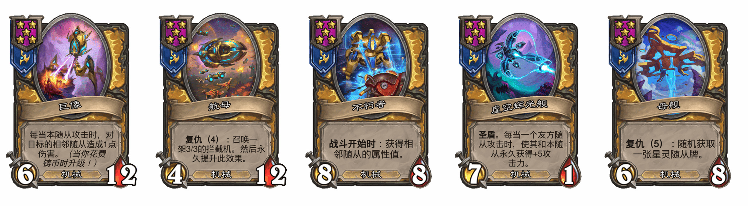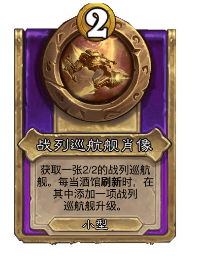 - [小型2费] 获取一张2/2的战列巡航舰。每当酒馆刷新时,在其中添加一项战列巡航舰升级。