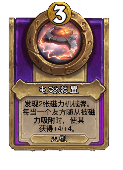 - [大型3费] 发现2张磁力机械牌。每当一个友方随从被磁力吸附时,使其获得+4/+4。