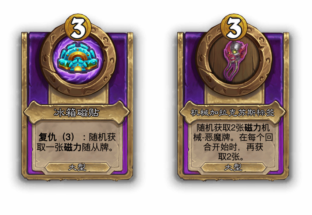 - 新:发现一张磁力机械牌。每当一个友方随从被磁力吸附时,使其获得+3/+3。